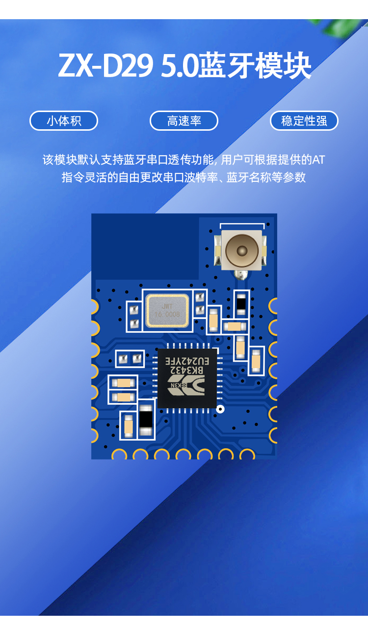 支持蓝牙双模协议,BLE速率高达4KB/S,SPP速率高达16KB/S